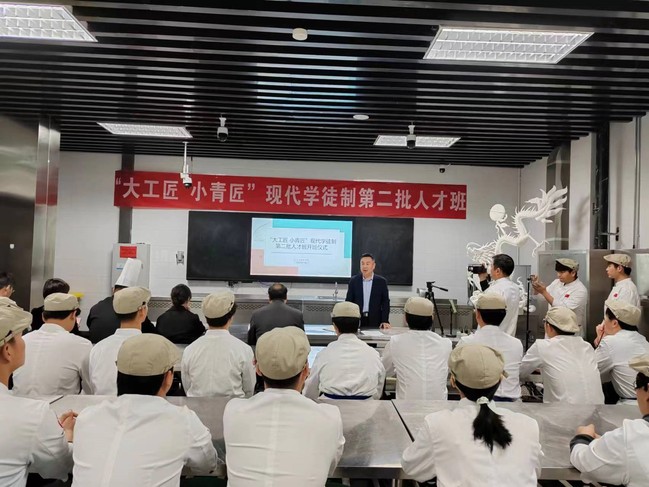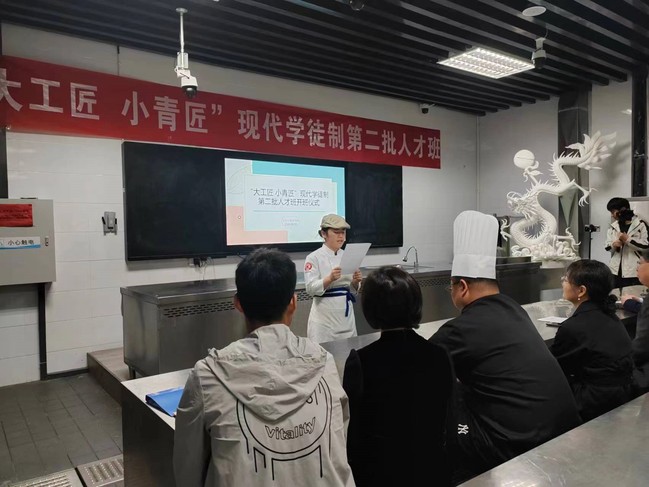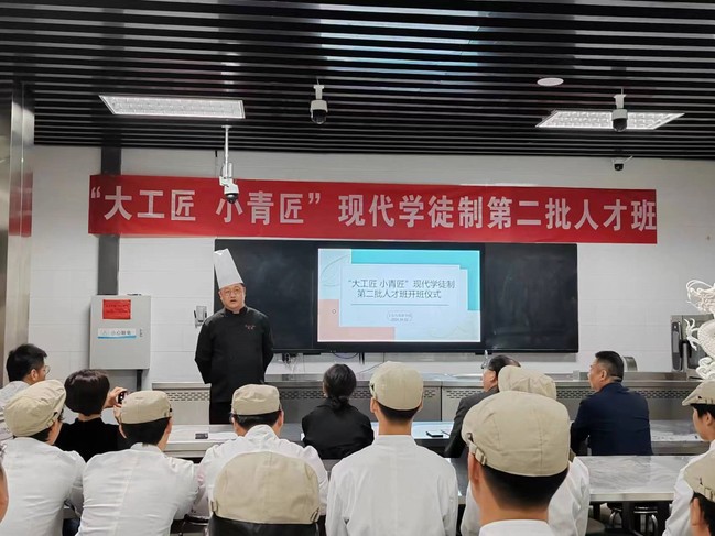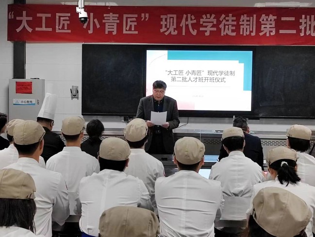 仪式开始,韦元民对“大工匠 小青匠”现代学徒制第二批人才班开班表示热烈祝贺并提出了殷切希望。他表示,此次学徒制人才班的开设,创新产教融合技能人才培养模式,继续推进知行合一与立德树人并举,让年轻的学徒感受到工匠精神的魅力,学习到大师的精湛技艺,成为烹饪技艺的传承和发扬人。