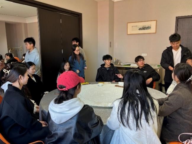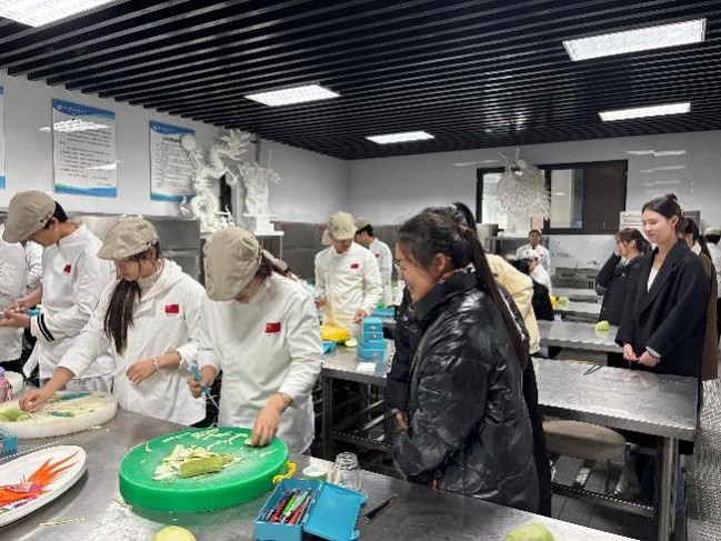 在烹饪产教融合生产性实训基地,学生们不仅参观了雅致的包间及繁忙的厨房,更深入了解了餐厅的日常运营和服务标准。魏老师给同学们详细讲解了中餐摆台的相关知识,以及强调了服务过程中的服务意识和需要注意到的问题。同时让学生亲自上阵,体验餐厅服务的各个环节,引导学生们将课堂所学融入实际操作中。随后,同学们参观了基地的面点实训室、雕刻实训室,以及中餐热菜制作流程,让学生清楚了解中餐厅的厨房运作和酒店餐饮部产品的生产加工工艺。