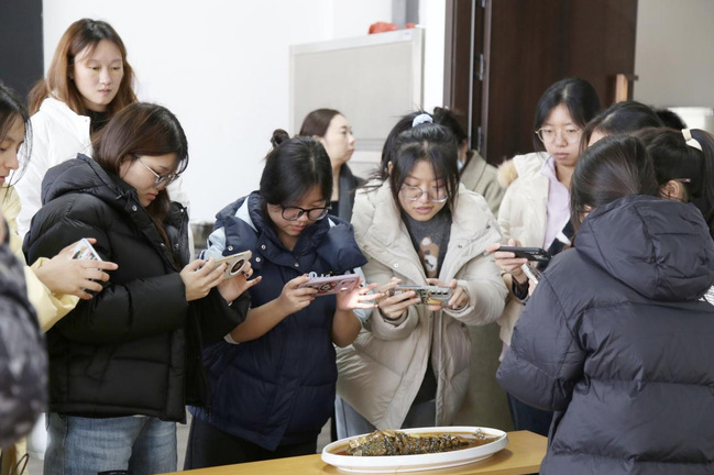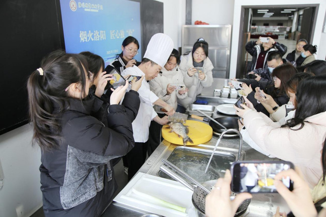 河南省中原大工匠、世界中餐推广大使,享受国务院特殊津贴专家牛恒林大师亲自上阵,演示了非遗美食--红烧黄河大鲤鱼的制作过程。学生们则拿起手中的手机等设备,认真记录下每一个精彩的瞬间。从食材的准备到烹饪技法的精妙呈现,从美食背后的传奇故事到其在当代社会的传承与创新,每一个细节都被镜头捕捉下来,成为永恒的记忆。