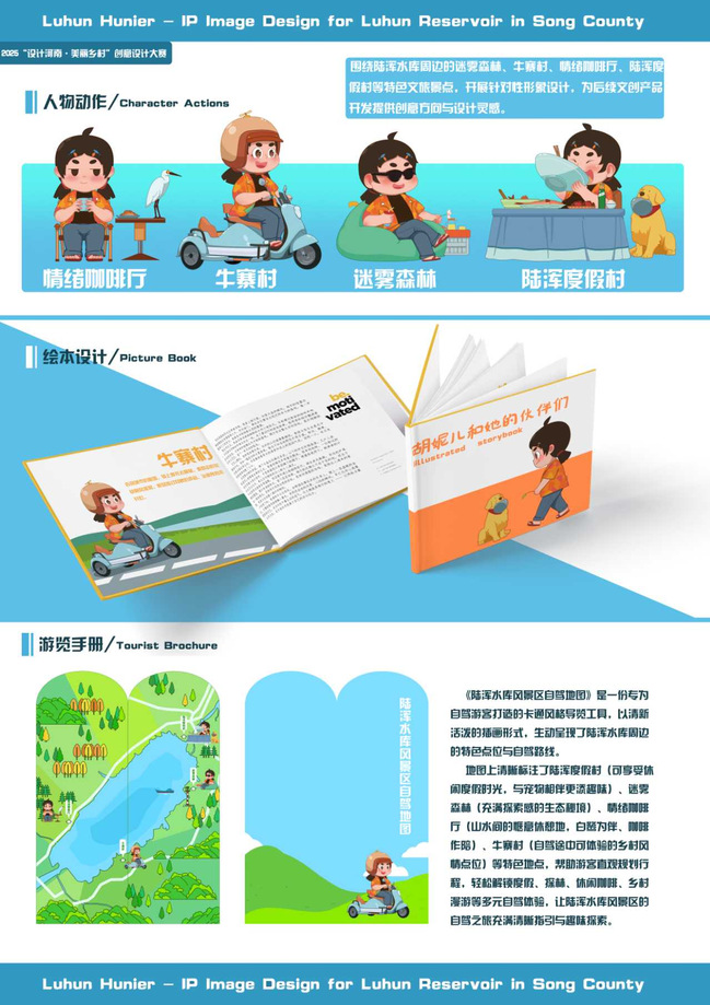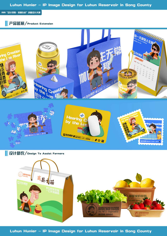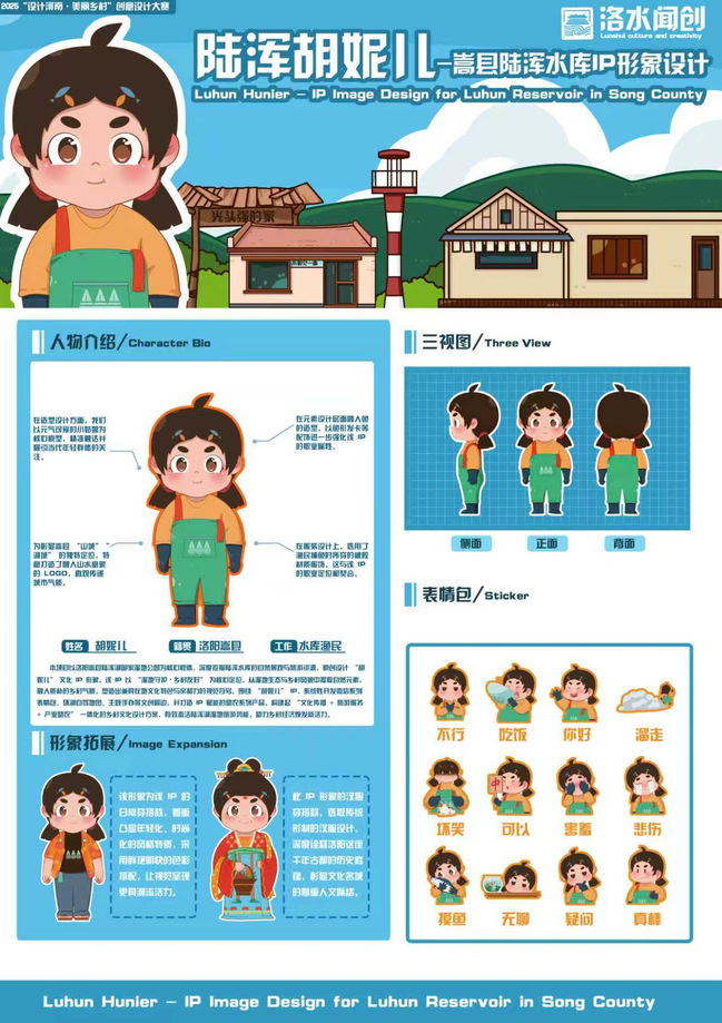 该作品由陈碧瑶、牛雅丽两位同学联合创作,王永康、于佳琳、魏秋霞三位老师组成指导教师团队全程把关。作品以嵩县陆浑水库为地域核心,深度融合当地自然生态与人文底蕴,打造出兼具亲和力与传播力的IP形象“陆浑胡妮儿”,生动诠释了“设计+农业+文化”的融合创新理念,彰显了青年学子助力乡村振兴的责任与担当。