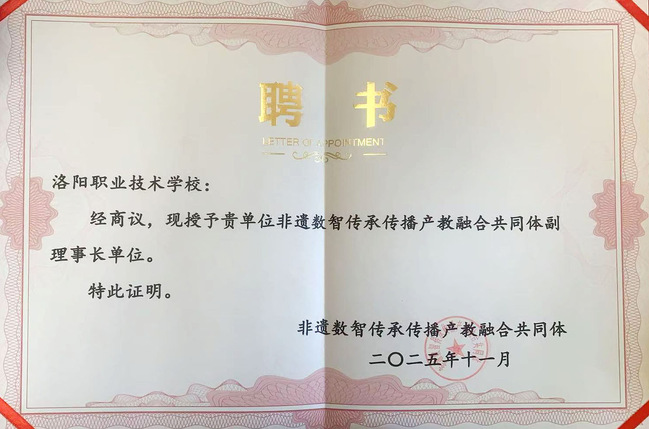 近日,非物质文化遗产数智传承与传播产教融合共同体成立会议顺利召开,洛阳职业技术学院文化遗产与传播学院凭借在非物质文化遗产传承创新、产教融合育人领域的深厚积淀与突出成果,获授共同体副理事长单位,标志着学院在非物质文化遗产数智化传播与校企协同育人方面迈入全国协作新平台。